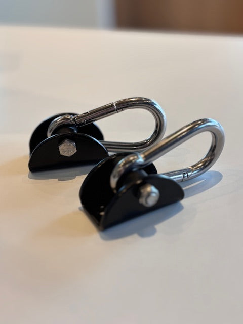 Takfästet med lager och karbinhake garanterar en lätt och friktionsfri gungrörelse. Ett ytterst stabilt, hållbart och diskret fäste för gymnastikringar, -rep, trapets, yogatyg m.m.